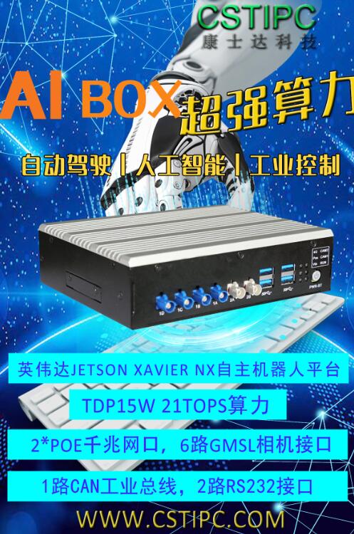 這款基于英偉達(dá)JETSON XAVIER NX自主機(jī)器人平臺的AI BOX,可謂是巔峰之作,超強(qiáng)算力, TDP15W 21TOPS算力,2個(gè)POE千兆網(wǎng)口; 6路GMSL相機(jī)接口,1路CAN工業(yè)總線; 2路RS232接口,支持9~36V寬電壓輸入,無風(fēng)扇散熱設(shè)計(jì)。在自動(dòng)駕駛,人工智能,工業(yè)控制領(lǐng)域提供高性能強(qiáng)穩(wěn)定的計(jì)算機(jī)硬件支持。